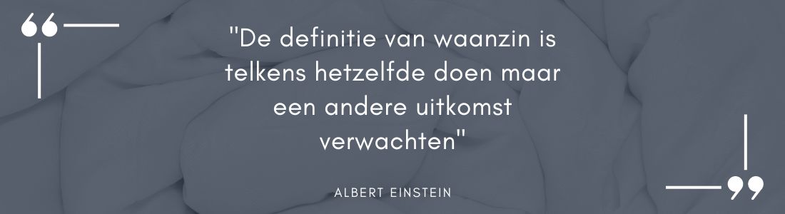 Albert Einstein zei het al: “De definitie van waanzin is telkens hetzelfde doen maar een andere uitkomst verwachten”. Dus als je jezelf elk oud & nieuw hetzelfde voorneemt is het niet realistisch om te verwachten dat het nu wel gaat lukken. Maar als je deze grote doelen nu eens hakt in kleine porties, kleine haalbare porties. Geen grote onbereikbare doelen, maar kleine handelingen of acties die in een dag amper tijd of energie kosten. Die brengen vaak wél een gedragsverandering op gang. En als je jezelf dan af en toe ook nog eens een compliment geeft over dat ene wat je wél hebt gedaan (hoe klein de moeite ook lijkt), dan staat niets je meer in de weg om alles klaar te spelen wat je in het vizier hebt.